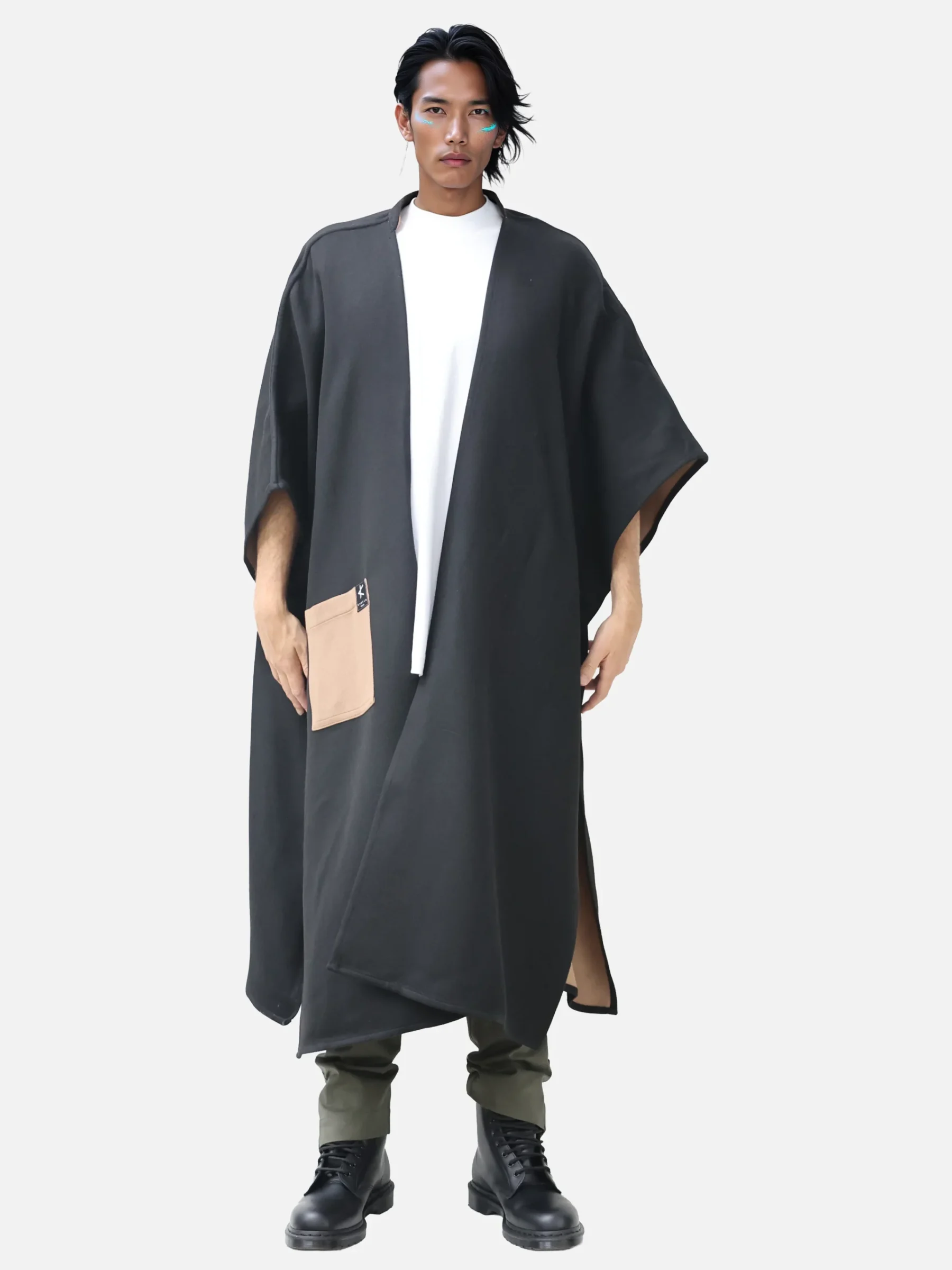 Fully reversible Flippa cape with mismatched side pockets. Closes with powerful neodymium magnets under the elbows.