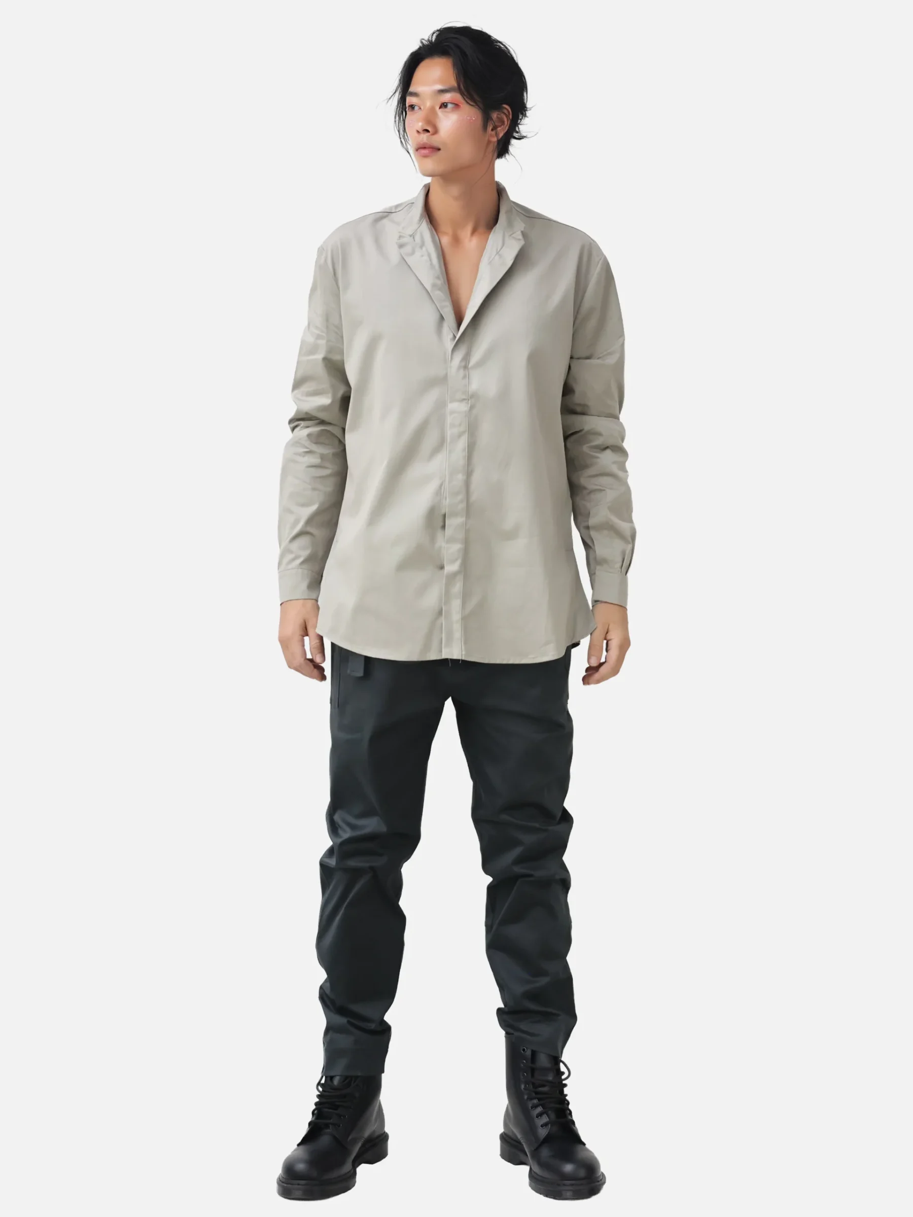 Yaku means function in Japanese. Cotton shirt from fashion house deadstock. Straight collar, slit on the sides. Closes with magnets on front and cuffs. Once open, no buttons are visible.
