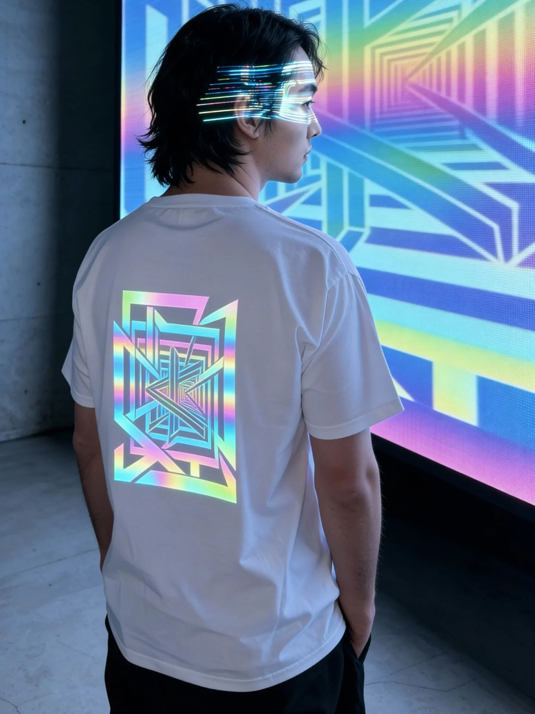 T-shirt unisexe au grammage lourd (240g/m²). Oversize en coton bio certifié haute qualité. Flex holographique réfléchissant